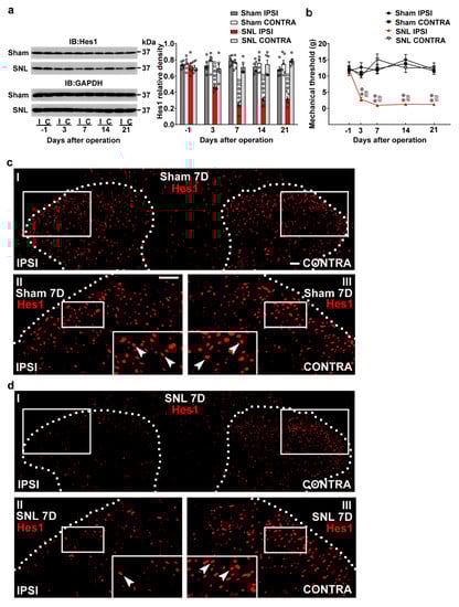Nerve injury reduced spinal Hes1 expression accompanied with behavioral allodynia. (a) Representative Western blot and statistical analyses (normalized to GAPDH) demonstrating, when compared with the sham operation (Sham), that spinal nerve ligation (SNL) decreased the expression of Hes1 in the ipsilateral (I and IPSI) but not the contralateral (C and CONTRA) dorsal horn at days 3, 7, 14, and 21 after surgery. IB, Immunoblotting. Two-way ANOVA with repeated measures over time, treatment, F (3,20) = 116.6, p < 0.0001; time, F (4,80) = 6.258, p = 0.0002; treatment × time, F(12,80) = 9.003, p < 0.0011. ** p < 0.01 vs. Sham IPSI. ## p < 0.01 vs. SNL day –1. n = 6. (b) Von Frey test demonstrating, when compared with the sham operation, that SNL decreased the tactile withdrawal threshold of the ipsilateral but not the contralateral hind-paw at days 3, 7, 14, and 21 after surgery. Two-way ANOVA with repeated measures over time, treatment, F (3,24) = 59.37, p < 0.0001; time, F(4,96) = 4.514, p = 0.0022; treatment × time, F(12,96) = 6.427, p < 0.0001. ** p < 0.01 vs. Sham IPSI. ## p < 0.01 vs. SNL day –1. n = 7. (c,d) Immunofluorescence images showing, when compared with the sham operation (c), that SNL (d) decreased the number and distribution of Hes1-positive neurons (red) in the ipsilateral dorsal horn (left) of spinal cord slice harvested at day 7 (7D) after surgery. Dashed lines indicate the margin of the dorsal horn. The lower images (II, III) are magnifications of the upper images (I); and the inset images at the bottom of the lower image are further amplified images, with arrows marking the Hes1-positive neurons. Scale bar = 50 μm; Thickness = 30 μm.