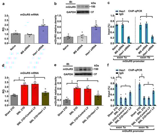 Neuropathic injury diminishes Hes1-repressed spinal mGluR5 transcription. (a,b) RT-PCR and western blot analyses (normalized to GAPDH) demonstrating that the mRNA and protein levels of mGluR5 in dorsal horn samples were increased by administering naïve animals (Naive) with Hes1 siRNA but not with missense siRNA (Hes1 siRNA and MS siRNA, respectively. 5 μg, 10 μL; it, daily for 4 days). IB, immunoblotting. mRNA, one-way ANOVA, post-hoc Tukey test, F (2,12) = 27.91, p < 0.0001. protein, one-way ANOVA, post-hoc Tukey test, F (2,15) = 34.80, p < 0.0001. ** p < 0.01 vs. Naïve. mRNA, n = 5. protein, n = 6. (c) ChIP-qPCR assay of dorsal horn samples demonstrating that administering naïve animals with Hes1 siRNA but not with missense siRNA (Hes1 siRNA and MS siRNA, respectively. 5 μg, 10 μL; it, daily for 4 days) decreased amounts of Hes1 antibody-precipitated exon 1a and exon 1b promoter fragments of mGluR5. ** p < 0.01 vs. Naïve. n = 5. Hes1, exon 1a, one-way ANOVA, post-hoc Tukey test, F (2,12) = 131.7, p < 0.0001. Hes1, exon 1b, one-way ANOVA, post-hoc Tukey test, F (2,12) = 22.70, p < 0.0001. (d,e) RT-PCR and western blot analyses of the ipsilateral dorsal horn samples dissected at day 21 after operation. When compared with the sham operation (Sham 21D), spinal nerve ligation (SNL 21D) increased mRNA and protein levels of mGluR5 that were both reversed by intrathecal administration to SNL animals with Hes1-encoding vector (SNL 21D + Hes1 LV) but not the control vector (SNL 21D + Control LV). mRNA, one-way ANOVA, post-hoc Tukey test, F(3,16) = 20.75, p < 0.0001. protein, one-way ANOVA, post-hoc Tukey test, F (3,20) = 34.70, p < 0.0001. ** p < 0.01 vs. Sham 21D. ## p < 0.01 vs. SNL 21D. mRNA, n = 5. protein, n = 6. (f) ChIP-qPCR assay of dorsal horn samples dissected at day 21 post operation. When compared with the sham operation, SNL decreased the amounts of Hes1 antibody-precipitated exon 1a and exon 1b promoter fragments of mGluR5; effects that were both reversed by transfecting animals with Hes1-encoding vector (SNL 21D + Hes1 LV) but not the control vector (SNL 21D + Control LV). Hes1, exon 1a, one-way ANOVA, post-hoc Tukey test, F (3,16) = 34.72, p < 0.0001. Hes1, exon 1b, one-way ANOVA, post-hoc Tukey test, F (3,16) = 45.74, p < 0.0001. ** p < 0.01 vs. Sham 21D. # p < 0.05, ## p < 0.01 vs. SNL 21D. n = 5.