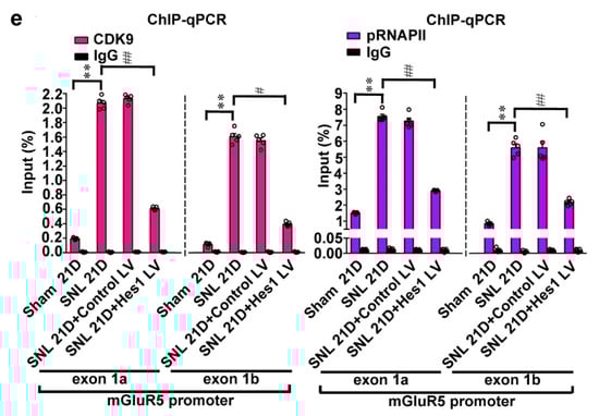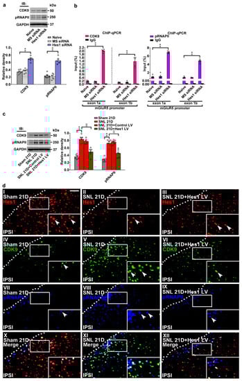 Neuropathic injury impedes Hes1-suppressed CDK9 recruitment and RNAPII phosphorylation on mGluR5 promoters. (a) Representative western blot and statistical analyses (normalized to GAPDH) of dorsal horn samples demonstrating the levels of CDK9 and phosphorylated RNAPII (pRNAPII) were increased by spinally administering naïve animals (Naïve) with Hes1-siRNA but not with missense siRNA (Hes1 siRNA and MS siRNA, respectively, 5 μg, 10 μL; daily for 4 days). IB, immunoblotting. CDK9, one-way ANOVA, post-hoc Tukey test, F (2,15) = 64.17, p < 0.0001. pRNAPII, one-way ANOVA, post-hoc Tukey test, F (2,15) = 59.83, p < 0.0001. ** p < 0.01 vs. Naïve. n = 6. (b) ChIP-qPCR assay of dorsal horn samples demonstrating that administering naïve animals with Hes1 siRNA, but not missense siRNA (Hes1 siRNA and MS siRNA, respectively. 5 μg, 10 μL; daily for 4 days), increased amounts of both CDK9 and pRNAPII antibody-precipitated exon 1a and exon 1b promoter fragments of mGluR5. CDK9, exon 1a, one-way ANOVA, post-hoc Tukey test, F (2,12) = 1494, p < 0.0001. CDK9, exon 1b, one-way ANOVA, post-hoc Tukey test, F(2,12) = 88.97, p < 0.0001. pRNAPII, exon 1a, one-way ANOVA, post-hoc Tukey test, F (2,12) = 358.4, p < 0.0001. pRNAPII, exon 1b, one-way ANOVA, post-hoc Tukey test, F (2,12) = 373.5, p < 0.0001. ** p < 0.01 vs. Naïve. n = 5. (c) Representative western blot and statistical analyses of dorsal horn samples dissected at day 21 after operation. When compared with the sham operation (Sham 21D), spinal nerve ligation (SNL 21D) increased spinal CDK9 and pRNAPII levels; that were both reversed by administering SNL animals with Hes1-encoding vector (SNL 21D + Hes1 LV) but not the control vector (SNL 21D + Control LV). CDK9, one-way ANOVA, post-hoc Tukey test, F (3,20) = 38.06, p < 0.0001. pRNAPII, one-way ANOVA, post-hoc Tukey test, F (3,20) = 43.90, p < 0.0001. ** p < 0.01 vs. Sham 21D. ## p < 0.01 vs. SNL 21D. n = 6. (d) Immunofluorescence images of spinal slices dissected at day 21 post operation. Compared with the sham operation (left), SNL (middle) decreased the number and distribution of the Hes1-positive (red) neurons but increased that of the CDK9-postive (green) and pRNAPII-postive (blue) neurons in the dorsal horn; these effects were all reversed by transfecting SNL animals with Hes1-encoding vector (right). Dashed lines indicate the margin of the dorsal horn. The inset images at the bottom are amplifications of the upper marked area, with arrows indicating the immunopositive neurons. Scale bar = 50 μm; Thickness = 30 μm. (e) ChIP-qPCR assay of dorsal horn samples dissected at day 21 post operation. When compared with the sham operation, SNL increased the amounts of CDK9 and pRNAPII antibodies-precipitated exon 1a and exon 1b promoter fragments of mGluR5; effects were both reversed by transfecting SNL animals with Hes1-encoding vector but not the control vector. CDK9, exon 1a, one-way ANOVA, post-hoc Tukey test, F (3,16) = 1812, p < 0.0001. CDK9, exon 1b, one-way ANOVA, post-hoc Tukey test, F (3,16) = 675.6, p < 0.0001. pRNAPII, exon 1a, one-way ANOVA, post-hoc Tukey test, F (3,16) = 638.7 p < 0.0001. pRNAPII, exon 1b, one-way ANOVA, post-hoc Tukey test, F (3,16) = 103.0 p < 0.0001. ** p < 0.01 vs. Sham 21D. # p < 0.05, ## p < 0.01 vs. SNL 21D. n = 5.