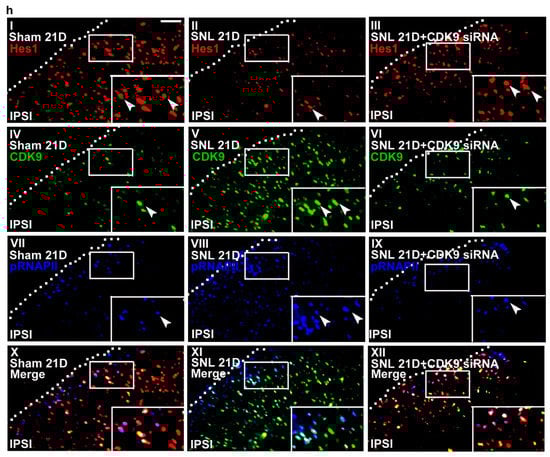 Neuropathic injury induces allodynia with reciprocal changes in spinal Hes1-CDK9 levels. (a) Representative Western blot and statistical analyses (normalized to GAPDH) of the dorsal horn sample dissected from naïve animals (Naïve) at day 4 after the start of treatment. The abundance of CDK9 was not affected by implantation of an intrathecal catheter alone (it) or spinal administration of polyethylenimine (PEI, 10 μL; daily for 4 days) or missense siRNA (MS siRNA, 5 μg, 10 μL; daily for 4 days) but was dose-dependently decreased by intrathecal administration of CDK9 siRNA (CDK9 siRNA; 1, 3, and 5 μg; 10 μL; daily for 4 days). IB, Immunoblotting. One-way ANOVA, post-hoc Tukey test, F (6,35) = 10.16, p < 0.0001. ** p < 0.01 vs. Naïve. n = 6. (b) Rota-rod test demonstrating no statistical difference in the motor performance among naïve animals as well as naïve animals administered with polyethylenimine, missense siRNA, or CDK9 siRNA (5 μg, 10 μL). The gray bar at the bottom indicates the duration of the reagents’ administration. n = 7. Two-way ANOVA with repeated measures over time, treatment, F (3,24) = 0.4792, p = 0.6997; time, F (4,96) = 0.2094, p = 0.9351; treatment × time, F (12,96) = 1.123, p = 0.3510. (c,d) Von Frey test demonstrating that while it exhibited no effect on the sham-operated group, spinal administration of CDK9 siRNA (5 μg, 10 μL), but not missense siRNA or polyethylenimine, increased the withdrawal threshold of the ipsilateral hind paw of SNL rats at days 19, 20, and 21 after operation. The gray bar at the bottom indicates the duration of the reagents’ administration. * p < 0.05, ** p < 0.01 vs. SNL. n = 7. Sham, Two-way ANOVA with repeated measures over time, treatment, F (3,24) = 0.2648, p = 0.8501; time, F (4,96) = 0.4465, p = 0.7747; treatment × time, F(12,96) = 0.3796, p = 0.9679. SNL, Two-way ANOVA with repeated measures over time, treatment, F (3,24) = 32.28, p < 0.0001; time, F(4,96) = 7.267, p < 0.0001; treatment × time, F(12,96) = 5.291, p < 0.0001. (e,f) RT-PCR and western blot analyses (normalized to GAPDH) of ipsilateral dorsal horn samples dissected at day 21 post operation. When compared with the sham operation (Sham 21D), SNL (SNL 21D) increased the abundance of mGluR5 mRNA as well as CDK9, phosphorylated RNAPII (pRNAPII), and mGluR5 protein but decreased that of Hes1 protein. These effects were all reversed by administering SNL animals with CDK9 siRNA (SNL 21D + CDK9 siRNA) but not the missense siRNA (SNL 21D + MS siRNA). mGluR5 mRNA, one-way ANOVA, post-hoc Tukey test, F (3,16) = 8.639, p = 0.0012. Hes1, one-way ANOVA, post-hoc Tukey test, F (3,20) = 19.59, p < 0.0001. CDK9, one-way ANOVA, post-hoc Tukey test, F (3,20) = 27.98, p < 0.0001. pRNAPII, one-way ANOVA, post-hoc Tukey test, F (3,20) = 32,00, p < 0.0001. mGluR5 protein, one-way ANOVA, post-hoc Tukey test, F (3,20) = 21.31, p < 0.0001. ** p < 0.01 vs. Sham 21D. ## p < 0.01 vs. SNL 21D. mRNA, n = 5. protein, n = 6. (g) ChIP-qPCR assay of dorsal horn samples dissected at day 21 post operation. Compared to the sham operation, SNL decreased the levels of Hes1 antibody-precipitated but increased that of CDK9 and pRNAPII antibodies-precipitated exon 1a and exon 1b promoter fragments of mGluR5. These effects were all reversed by administering SNL animals with CDK9-targeting antisense siRNA, but not with the missense siRNA. Hes1, exon 1a, one-way ANOVA, post-hoc Tukey test, F (3,16) = 380.8, p < 0.0001. Hes1, exon 1b, one-way ANOVA, post-hoc Tukey test, F (3,16) = 29.54, p < 0.0001. CDK9, exon 1a, one-way ANOVA, post-hoc Tukey test, F(3,16) = 727.1, p < 0.0001. CDK9, exon 1b, one-way ANOVA, post-hoc Tukey test, F (3,16) = 856.4, p < 0.0001. pRNAPII, exon 1a, one-way ANOVA, post-hoc Tukey test, F (3,16) = 1888 p < 0.0001. pRNAPII, exon 1b, one-way ANOVA, post-hoc Tukey test, F(3,16) = 129.1 p < 0.0001. ** p < 0.01 vs. Sham 21D. # p < 0.05, ## p < 0.01 vs. SNL 21D. n = 5. (h) Immunofluorescence images of spinal slices dissected at day 21 post operation. When compared with the sham operation (left), SNL (middle) decreased the number and distribution of Hes1-positive (red) but increased that of CDK9- (green) and pRNAPII-positive (blue) neurons in the dorsal horn ipsilateral to operation; these effects were all reversed by administering SNL animals with CDK9 siRNA (SNL 21D + CDK9 siRNA) (right). Dashed lines indicate the margin of the dorsal horn. The images at the bottom are amplifications of the marked area, with arrows indicating the immunopositive neurons. Scale bar = 50 μm; Thickness = 50 μm.