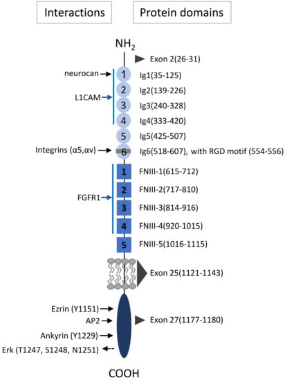 - Oleszewski, M.; Beer, S.; Katich, S.; Geiger, C.; Zeller, Y.; Rauch, U.; Altevogt, P. Integrin and neurocan binding to L1 involves distinct Ig domains. J. Biol. Chem. 1999, 274, 24602–24610. [Google Scholar] [CrossRef]