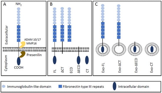 L1CAM cleavage and nomenclature of L1CAM forms discussed in this review. (A) Structure of L1CAM including main cleavage sites. ADAM: A Disintegrin and metalloproteinase domain-containing protein. MMP: matrix metalloprotease. (B) Full-length L1CAM (FL) and forms resulting from proteolytic cleavage. ΔCT lacks the C-terminal domain, NT represents the soluble N-terminal domain, ΔNT lacks the N-terminal domain, CT represents the cytosolic C-terminal cleavage product. (C) Shows exosomal forms (Exo) corresponding with the full-length or proteolytic cleavage forms indicated in B.