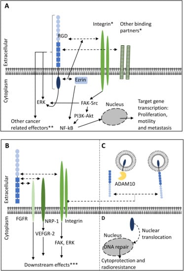 Twelve studies investigated the effects of the cleaved, soluble N-terminal ectodomain of L1CAM (L1CAM-ECD) on tumor progression, mostly focusing on gliomas, ovarian cancer, and pancreatic cancer [16,33,34,40,41,44,67,74,75,76,77,78]. Increased levels of L1CAM-ECD are caused by an upregulation of ADAM 10 in glioma, ovarian cancer and colon and cancer cells [16,26,40,41], and shedding is promoted by the presence of serum or HGF [33], hypoxia or apoptotic stimuli [16]. With the exception of breast cancer [44], L1CAM-ECD stimulated migration and invasion in all studies. In glioma, L1CAM-ECD promotes cell migration and proliferation by a mechanism that depends on αvβ3 and αvβ5 integrins and FAK, and on FGFR1 activity [40,41,74,75], suggesting that the L1CAM-ECD mediates its effect by heterophilic interactions of both integrins and the FGFR1 in these tumors. In ovarian cancer, L1CAM-ECD interacts with to α5β1, αvβ5, and αvβ3 integrins [16,77], and with NRP-1, the latter of which allows for binding the mesothelium [67]. L1CAM-ECD stimulated the activation of ERK, FAK and Src and provided resistance against apoptosis [16,33,76] and increased L1CAM-ECD in ovarian cancer patients correlates with increased chemoresistance [34]. Furthermore, heterotypic interactions of L1CAM-ECD from ovarian cancers and α3 integrins of endothelial cells, promotes angiogenesis through the vascular endothelial growth factor receptor 2 (VEGFR-2) [77]. Finally, a study focusing on pancreatic cancer demonstrated that, L1CAM-ECD cleaved from Schwann cells homotypically interacts with L1CAM on tumor cells leading to the activation of ERK and STAT3-mediated expression of MMP-2 and -9 which facilitates cancerous nerve invasion [78].