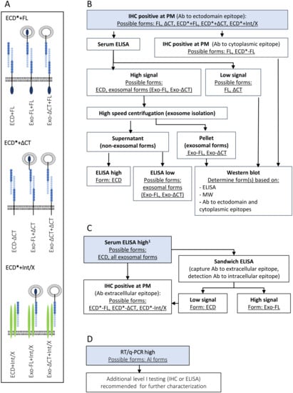 Suggested algorithm for the assessment of the form and location of L1CAM based on common clinical analyses of L1CAM expression. (A) Analysis of L1CAM is most commonly assessed by IHC using ECD-domain-reacting antibodies. In addition to recognizing L1CAM-FL or L1CAM-ΔCT, positive staining at the plasma membrane can represent homotypic interactions of L1CAM-FL or L1CAM-ΔCT with soluble ECD, or with exosomal forms expressing the ECD (collectively indicated ECD * + FL or ECD * + ΔCT). Positive staining at the plasma membrane may also be due to heterotypic interactions of ECD-containing soluble or exosomal L1CAM forms with other proteins, such as integrins (Int) or other undefined proteins (X). These heterotypic interactions are indicated with ECD * + Int/X. (B) Suggested diagnostic algorithm based on initial positive IHC staining with an ECD-domain-reacting antibody. Suggested follow-up analysis should includes ELISA analysis of serum to determine the level of soluble forms. The presence of FL can be assessed by IHC using a CT-domain-specific antibody, the staining of which should overlap with ECD-specific antibody staining in case of expression of FL. More detailed analyses to distinguish soluble forms can be done by high speed centrifugation of serum samples, by which soluble ECD and exosomal forms can be distinguished. Additional western blot and ELISA analysis using ECD- and CT-reactive antibodies can further stratify exosomal forms by analysis of molecular weight and the presence or absence of either domain. Ab is antibody. Nomenclature of L1CAM forms is also given in the legends of Figure 1C and Figure 2B. (C) Algorithm based on initial assessment of L1CAM in serum by ELISA. ELISA outcome depends on type of ELISA and on the antibodies used. This algorithm assumes direct ELISA, or a sandwich ELISA with either or both antibodies reacting with the ECD, or a commercial assay with proprietary information regarding antibodies. Downstream analyses to distinguish CT-containing forms from FL may include sandwich ELISA combining CT- and ECD-reacting antibodies, and/or IHC with a ECD-reacting antibody, which may be expanded to additional analyses as indicated in B. (D) Increased L1CAM expression as determined by RT/qPCR will not provide information on processing and cleavage form of L1CAM and additional analyses by IHC and ELISA is recommended.