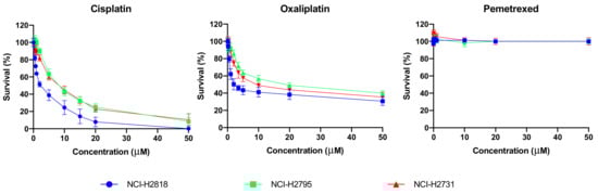 Dose-response curves of cisplatin, oxaliplatin and pemetrexed treatment. Each graph illustrates the survival curve of our three MPM cell lines after 72 h of treatment with either cisplatin, oxaliplatin or pemetrexed. The error bars indicate the standard deviation (n = 3). Statistical analysis showed significant differences for cisplatin (p = 0.001–0.020) and oxaliplatin (p = 0.001–0.009) sensitivity of the different cell lines.