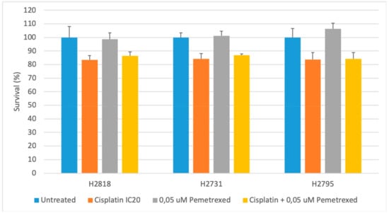 Cytotoxic effect of a combination of cisplatin and pemetrexed. The graph represents the percentage cell survival of three MPM cell lines (NCI-H2818, NCI-H2731 and NCI-H2795) after 72 h of chemotherapeutic treatment with either cisplatin, pemetrexed or cisplatin + pemetrexed compared to an untreated control group. No significant differences were found between the different treatments. Error bars represent the standard deviation (n = 3).