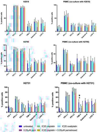 Taken together, we are the first to describe a small effect of cisplatin, pemetrexed, oxaliplatin and cisplatin + pemetrexed on the immune checkpoints LAG-3 and TIM-3 as well as the TIM-3 ligand, galectin-9 in vitro. Similar to our obtained data, lowered TIM-3 expression was also described in diffuse large B-cell lymphoma after chemotherapeutic treatment. In contrast to our study, reduced TIM-3 expression was noted after sequential administration of different chemotherapeutic agents (rituximab, cyclophosphamide, doxorubicin, vincristine and prednisone) []. Since a high interexperimental variability with regard to the effect of chemotherapy on immune checkpoint expression was observed in our study, we cannot draw a firm conclusion about the best treatment schedule for combining immunotherapy with chemotherapy in MPM. Further preclinical testing for this combination strategy is required to identify the most promising regimen for this auspicious multimodal approach.