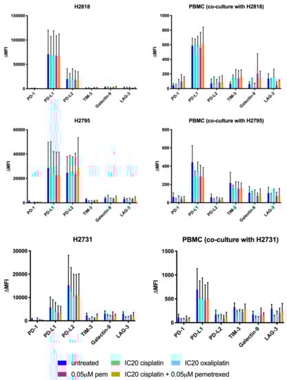 Influence of chemotherapeutics on immune checkpoint expression on MPM cell lines and PBMC in co-culture (ΔMFI values). Bar charts of mean ΔMFI values representing the expression of the immune checkpoints or ligands on NCI-H2818, NCI-H2795, NCI-H2731 and corresponding PBMC. Expression is determined after treatment. Error bars represent the standard deviation (n = 3). p < 0.05: significant difference in immune checkpoint or ligand expression. Isotype controls were used to consider aspecific binding of the flow cytometry staining.