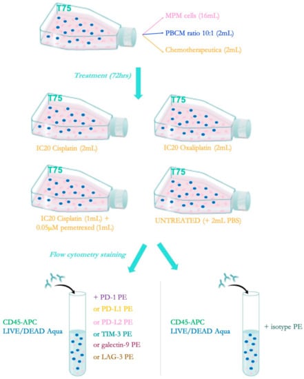 In order to determine the best treatment schedule for combining chemotherapy with immunotherapy, flow cytometry (FCM) was used to examine the effect of the chemotherapeutics on the expression of the immune checkpoints and their ligands. For the experimental set-up, shown in Figure 5, MPM cells were cultured in T75-culture flasks. At 80% confluence, the MPM cells were placed in co-culture with healthy donor PBMC at a 10:1 (Effector: Target) ratio and treated with chemotherapy. PBMC were added to consider the effect that immune cells in the tumor microenvironment might have on the expression of ICPs. After 72 h, PBMC and MPM cells were harvested and transferred into FACS tubes for multicolor FCM on a BD FACSAria II flow cytometer (BD BioSciences, Erembodegem, Belgium).