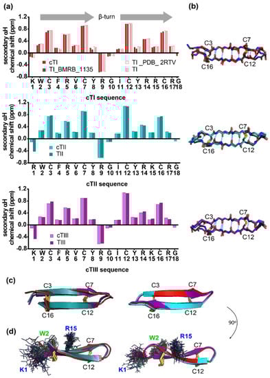 The NMR structures of TI and cTI (red), TII and cTII (cyan), TIII and cTIII (magenta). (a) Secondary αH chemical shift at 298 K determined from 1H NMR spectra. Shifts were calculated by subtraction of random coil 1H NMR shifts [] from the experimental values. For tachyplesin I (TI), the shifts of the peptide synthesized in our lab were compared to shifts obtained from data banks: TI—PDB ID 2RTV [], and TI—BMRB ID 1135 []. Positive shifts greater than 0.1 ppm suggest β-strands, indicated by grey arrows. (b) Overlay of the cyclic analogues (colored backbone) with their respective parent peptide (grey backbone). Hydrogen bonds between β-strands are indicated in blue. The structure of TI was obtained from the PDB (ID 1WO0). (c) Overlay of TI–TIII and cTI–cTIII. (d) Mobility of the residues (K or R) at position 1 and 15, which differ between the peptides, and of W2 of the native sequences and cyclic analogues, respectively.