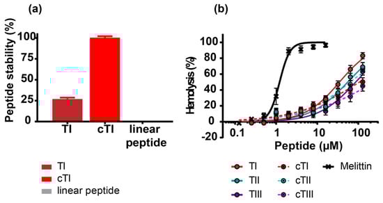 Cyclization has been shown to increase stability [,] and reduce the hemolytic activity of some peptides [,]. Comparison of resistance to human proteases showed that the cTI analogue did not degrade after treatment for 24 h in 25% (v/v) human serum, whereas only 25% of TI remained in the solution (see analytical RP-HPLC chromatograms in Supplementary Figure S2). A peptide (linear and without disulfide bonds) used as a control was fully degraded under the same conditions (Figure 2a). TI has previously been shown to be completely stable for 2 h in mouse or human serum [].