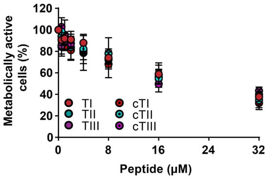 The percentage of hemolysis of human red blood cells (RBCs) followed the trend TI > TII > TIII > cTII > cTI > cTIII when compared at 128 µM, the highest concentration of peptide tested. TI was the most hemolytic of the native sequences. Backbone cyclization reduced the hemolytic activity of the cTI and cTIII compared to their parent counterparts, but led to no clear improvement for cTII. The C-amidated peptides TI–TIII lysed 66%, 56% and 41% of RBCs at 64 µM respectively (Figure 2b and Table 2). A similar trend but lower hemolytic activity had been reported for TI, TII, and TIII lacking C-terminal amidation at higher peptide concentrations [], which is known to impact peptide activity [,].