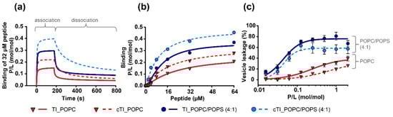 Membrane binding and disruption induced by tachyplesin I (TI) and cyclic tachyplesin I (cTI). Model membranes composed of 1-palmitoyl-2-oleoyl-sn-glycero-3-phosphocholine (POPC) and POPC/1-palmitoyl-2-oleoyl-sn-glycero-3-phosphoserine (POPS) (4:1) were compared. (a) Surface plasmon resonance sensorgrams obtained with 32 µM peptide injected over lipid bilayers deposited on an L1 chip surface for 180 s (association); dissociation was monitored for 600 s. Response units (RU) were converted into a peptide-to-lipid ratio (P/L (mol/mol)) to take into consideration the differences in lipid packing resulting in different amounts being deposited to cover the chip surface. (b) The dose-response curves show P/L obtained at the end of the association phase (t = 170 s) and plotted as a function of peptide concentration injected. (c) Percentage of vesicle leakage determined by fluorescence emission intensity of 5-carboxyfluorescein (λex = 490 nm, λem = 513 nm) leaking from LUVs at increasing concentrations of peptide. Lipid concentration used was 5 µM, and the peptide was tested up to 10 µM. Dose-response curves were fitted with one-site specific binding with Hill slope equation in GraphPad Prism.