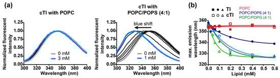 TI and cTI bound to both zwitterionic POPC and negatively-charged POPC/POPS (4:1) bilayers, as shown with SPR (see Figure 4a,b); however, a blue shift in the Trp fluorescence emission spectra was only observed for model membranes containing negatively-charged phospholipids (Figure 5a, Table 7). Even at the highest concentration of 3 mM POPC LUVs, no change in the Trp fluorescence emission spectra was observed for any of the peptides. In contrast to POPC, a blue shift was detected when peptides were incubated with negatively-charged model membranes POPC/POPS (4:1) and POPC/POPG (4:1) at lipid concentrations as low as 0.1 mM (Figure 5).