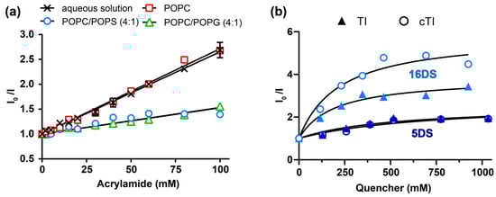 The effect of aqueous (acrylamide) and lipidic (5DS and 16DS) quenching on the tryptophan fluorescence intensity to investigate peptide in-depth location within model membranes. (a) The Trp fluorescence emission of 12.5 µM cTI in aqueous solution or in the presence of LUVs (1 mM POPC (1-palmitoyl-2-oleoyl-sn-glycero-3-phosphocholine), 1 mM POPC/POPS (1-palmitoyl-2-oleoyl-sn-glycero-3-phosphoserine; 4:1), 0.1 mM POPC/POPS (4:1) or 0.1 mM POPC/POPG (1-palmitoyl-2-oleoyl-sn-glycero-3-phosphoglycerol; 4:1)) in the absence (I0) and upon titration with increasing concentrations of acrylamide (I). Data are shown as Stern-Volmer plots (i.e., I0/I versus concentration of quencher). (b) Quenching of Trp fluorescence emission of 12.5 µM TI and cTI incorporated in 1 mM POPC/POPS (4:1) membranes by 5DS or 16DS.