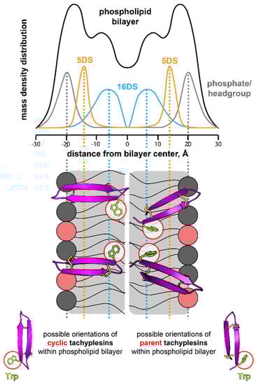 Schematic representation of the proposed orientations of tachyplesin peptides and cyclic analogues, when inserted into negatively-charged membranes based on the tryptophan fluorescence quenching, results with 5- and 16DS. The phospholipids in grey represent PC headgroups and the phospholipids in red represent PS headgroups. The peptides have a backbone length of approximately 25 Å (measured in PyMol) and are able to span across a lipid monolayer. Other orientations are possible. The distribution of the 5DS and 16DS quencher within a phospholipid bilayer was illustrated based on previous publications [,].
