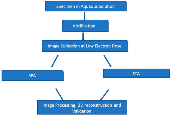 The impact of cryo-EM through improved sample preparation methods [40], application of direct electron detector (DED), and advanced computational algorithms with the capacity to accurately resolve images of structurally heterogeneous specimens initiated the so called “resolution revolution” era [41,42,43]. A general schematic of cryo-EM shown in Figure 1 involves specimen preparation, low dose image collection, and model building. These steps are common to all types of cryo-EM experiments. Single particle analysis (SPA) and Sub-tomogram averaging (STA) comprise two models for data collection and 3D reconstruction [44].
