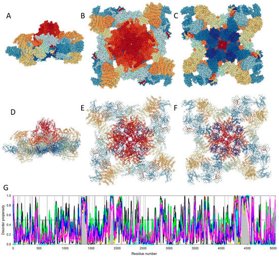 Structural characterization of rabbit RyR1 by single-particle cryo-EM (protein data bank (PDB) ID: 5T15) and a set of commonly used predictors of intrinsic disorder. (A). Side view of the channel in a space-fill representation. (B). Membrane-side view of the channel in a space-fill representation. (C). Cytoplasmic-side view of the channel in a space-fill representation. (D). Side view of the channel in a cartoon representation. (E). Membrane-side view of the channel in a cartoon representation. (F). Cytoplasmic-side view of the channel in a cartoon representation. In these plots, the chains are colored using the rainbow schema of the PDB 3D-viewer (where the N- and C-terminal regions are colored blue and red, respectively). (G). Evaluation of the intrinsic disorder propensity of rabbit RyR1 (UniProt ID: P11716) by a set of commonly used disorder predictors. Presented disorder profiles were generated by PONDR-FIT (pink curve), PONDR® VLXT (black curve), PONDR® VSL2 (green curve), and PONDR® VL3 (red curve) [106,107,108,109,110,111], as well as two tools from the IUPred web server for predicting short and long disordered regions (blue and yellow curves, respectively) [112]. The dark cyan dashed line shows the mean disorder propensity calculated by averaging the disorder profiles of the individual predictors. The light pink shadow around the PONDR® FIT shows error distribution, whereas the light cyan shadow around the mean disorder curve reflects the distribution of standard deviations. Light gray bars show positions of structurally uncharacterized regions. In these analyses, the predicted intrinsic disorder scores above 0.5 are considered to correspond to the disordered residues/regions, whereas regions with disorder scores between 0.2 and 0.5 are considered flexible.