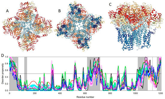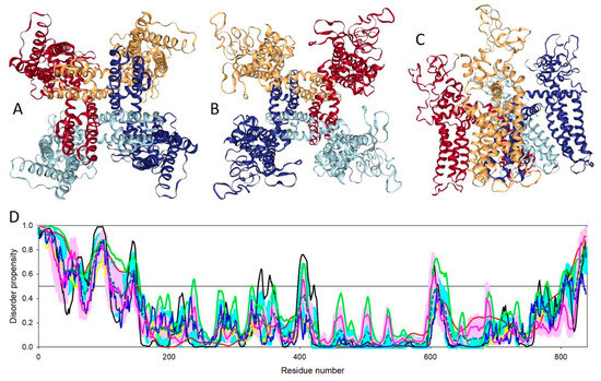 Three projections of the 3D structure of the homo-tetrameric Slo2.2 Na+-activated K+ channel (chicken KCNT1) resolved by single-particle cryo-EM (PDB ID: 5U70, [144]): (A). Cytoplasm view; (B). Membrane view; and (C). Side view. (D). Evaluation of the intrinsic disorder propensity of the chicken KCNT1 (UniProt ID: Q8QFV0) by a set of commonly used disorder predictors. Presented disorder profiles were generated by PONDR-FIT (pink curve), PONDR® VLXT (black curve), PONDR® VSL2 (green curve), and PONDR® VL3 (red curve) [106,107,108,109,110,111], as well as two tools from the IUPred web server for predicting short and long disordered regions (blue and yellow curves, respectively) [112]. The dark cyan dashed line shows the mean disorder propensity calculated by averaging the disorder profiles of the individual predictors. The light pink shadow around the PONDR® FIT shows the error distribution, whereas the light cyan shadow around the mean disorder curve reflects the distribution of the standard deviations. The light gray bars show positions of structurally uncharacterized regions. In these analyses, the predicted intrinsic disorder scores above 0.5 are considered to correspond to the disordered residues/regions, whereas regions with disorder scores between 0.2 and 0.5 are considered flexible.