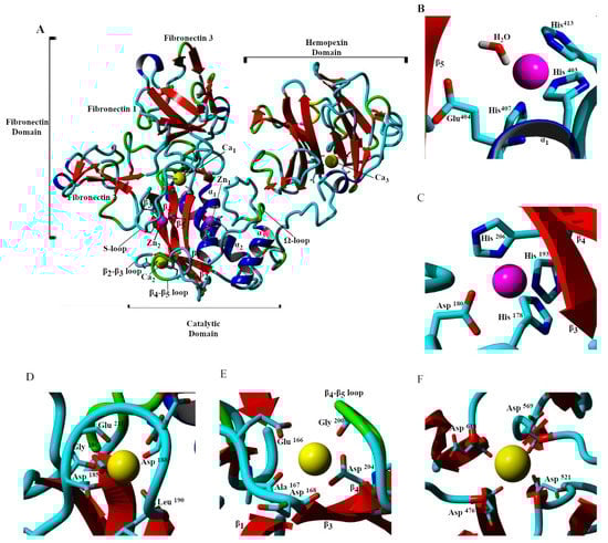 The ribbon diagram of the X-ray crystal structure of 1CK7. The pro-peptide (Pro31-Gln109) region is removed, and the unresolved link (Asp450-Thr460) connecting the Cat and Hpx domains built with YASARA [16]. Domains, subdomains, and secondary structural features of the catalytic domain are labeled accordingly (blue, α-helix; red, β-sheet; green, β-turn/bend; and aqua, coil) (A). The associated ions are shown as van der Waals radii with Zn2+ pink and Ca2+ yellow. The catalytic Zn2+ ion 1 is bound to His403, Glu404, His407, His413, and catalytic water (B). Zn2+ ion 2 is bound to His178, Asp180, His193, and His206 (C). Ca2+ ion 1 is bound to Asp185, Gly186, Asp188, Leu198, Asp208, and Glu211 (D). Ca2+ ion 2 is bound to Glu166, Ala167, Asp168, Gly200, Gly202, and Asp204 (E). Ca 2+ ion 3 is bound to Asp 476, Asp521, Asp569, and Asp618 (F).