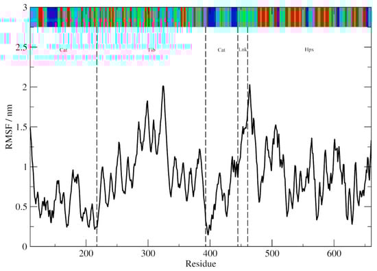 The Cα-trace root mean square fluctuation (RMSF). The DSSP assigned secondary structure (sampled >50% of the simulation time) is shown at the top of the graph (blue, α-helix; red, β-sheet; green, β-turn/bend; and aqua, coil). The Cat, Fib and Hpx domains and Lnk regions are demarcated with dotted lines.