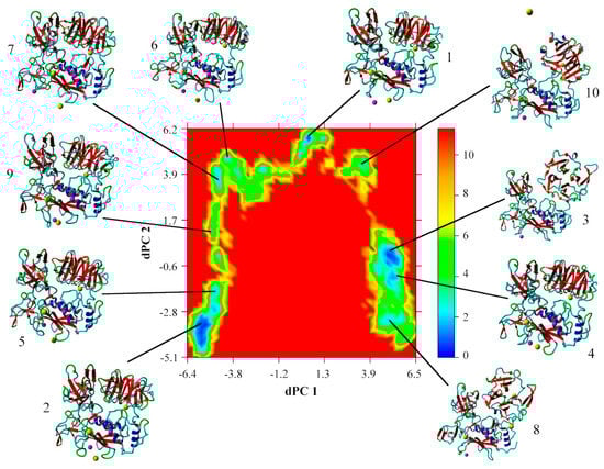 - Mu, Y.; Nguyen, P.H.; Stock, G. Energy landscape of a small peptide revealed by dihedral angle principal component analysis. Proteins 2005, 58, 45–52. [Google Scholar] [CrossRef]