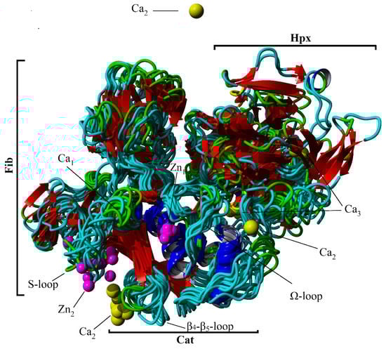 The free energy landscape created by the first two dihedral principle components (dPC) is shown in Figure 3, with the corresponding lowest energy centroid conformations as determined by k-means clustering. The most conformationally stable region is the Cat domain in which the active site Zn2+ ion 1 is bound by His residues of the α1-helix and the Ω-loop (Figure 3 and Figure 4). The structure around Ca2+ ion 1 also is stable with the cation bound within a pocket created by the distal portion of the S-loop and the interim loop connecting the Cat and Fib domains. This stability is also confirmed by the low RMSD and RMSF values for the Cat domain and those of Zn2+ ion 1 and Ca2+ ion 1 with both ions staying closely associated with the Cat domain of the protein and approximate to their crystallographically defined positions during the simulation (Table 2 and Table 3 and Figure 3 and Figure 4). The other associated metal ions of the Cat domain do not share this degree of stability (Table 3). Zn2+ ion 2 remains associated with the S-loop, but loses contact with the crystallographically demonstrated interactions with the His residues on the β4- and β5-sheets. This may not be unexpected, since conformational flexibility within the S-loop region, as was reported previously [29] and may allow for changes in the binding pocket conformation necessary for substrate recognition. Ca2+ ion 2 does not remain in close contact with the β1-β3-loop and diffuses out of the binding pocket (Figure 3 and Figure 4). The Hpx associated Ca2+ ion 3 remains close to its crystallographically observed binding site (Figure 3 and Figure 4) with a relatively low RMSF (Table 3), but to a lower degree that either Zn2+ ion 1 or Ca2+ ion 1.