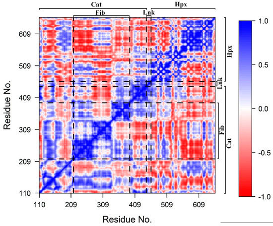 Dynamic cross-correlation matrix. Values range from -1 (complete anti-correlation) to +1 (complete correlation). The Cat, Fib, and Hpx domains and Lnk regions are demarcated with dashed lines.