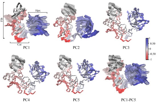 DCCM (Figure 5) demonstrated that motions within Cat, Fib and Hpx domains and Lnk region are, for the most part, highly correlated with a few exceptions. The first five principle components (PC) account for a total of 93.7% of the total domain motions (Figure 6). The plots of the Cα-trace RMSF of the projection of the trajectory onto the first five eigenvectors are shown (Figure S4). For PC1, the majority of the contributions arises from the first two subdomains of Fib, the Hpx domains and Lnk region. PC2, has significant motions in the third subdomain of Fib and Hpx. There are also anti-correlated motions with the Cat domain involving the α1-helix and β1- through β5-sheets that contain the active site. Motions along PC3 through PC5 represent minor fluctuations within the domains and global conformation. The distal portion of the Cat domain which contains the active site has correlated motions with the first and third subdomains of the Fib domain and the first and second blades of the Hpx domain. There are also anti-correlated motions between the active site on the Cat domain and the second subdomain of the Fib domain and the third and fourth blades of the Hpx domain.