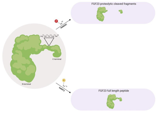Prior to FGF23 secretion from bone, post-translational modifications allow the peptide to circulate in the bloodstream as a full-length mature form (also called intact FGF23), which possess biological activity, or circulate as proteolytic cleaved fragments (Figure 1) [38,40,44,45]. This proteolytic cleavage event is executed by subtilisin-like pro-protein convertases, such as furin, which occurs at the consensus sequence Arg176-X-X-Arg179 and is not present in other FGF family members [38,44,46].