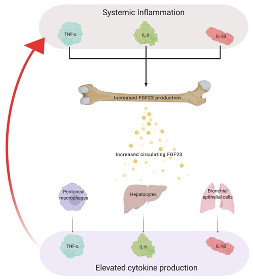 Moreover, FGF23 can also stimulate the production of inflammatory cytokines from other known reservoirs. In patients with chronic obstructive pulmonary disease (COPD) and cystic fibrosis (CF), serum FGF23 levels are significantly elevated [201,202,203,204]. For the first time, Krick et al. have shown that with the exposure of cigarette smoke, which is accountable for a large number of COPD cases, αKlotho expression is downregulated but FGFR4 expression in airway epithelial cells is increased [203]. These cellular alterations allow FGF23 to act on bronchial epithelial cells, which results in the activation of FGFR4/PLCγ/calcineurin/NFAT signaling and subsequent upregulation of IL-1β expression in COPD patients [203]. In addition to COPD, Krick et al. have shown that FGF23 targets CF-human bronchial epithelial cells to increase the secretion of IL-8, which is a key cytokine that contributes to chronic inflammation in CF patients [204,205]. Alongside these novel relationships between FGF23 and consequential interleukins, Han et al. further expanded the role of FGF23 in inflammation by revealing FGF23 targets peritoneal macrophages to upregulate TNF-α production [206].