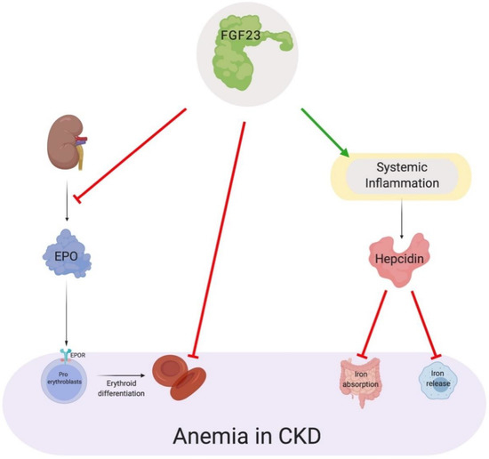 Cardiovascular disease is the leading cause of mortality across all stages of chronic kidney disease (CKD), and common occurrences such as fibroblast growth factor 23 (FGF23) excess, chronic inflammation and iron deficiency have been shown as prominent risk factors [1,2,3,4]. Over recent years, the interconnection between these factors has received considerable attention. This review focuses on the latest advances in understanding the complex role of FGF23 in inflammation and anemia, and how these multi-directional relationships present significant insights into the pathomechanisms of CKD.