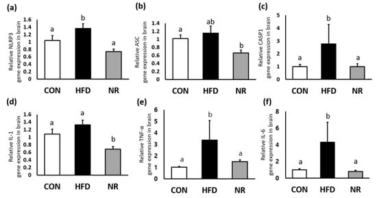 The effects of nicotinamide riboside (NR) on the nucleotide binding and oligomerization domain-like receptor family, pyrin domain containing 3 (NLRP3) inflammasome components and inflammatory markers in whole brains of mice. Relative gene expression of (a) NLRP3, (b) apoptosis-associated speck-like protein containing a caspase recruitment domain (ASC), (c) caspase 1 (CASP1), (d) interleukin (IL)-1, (e) tumor necrosis factor (TNF)-α, and (f) IL-6. Values represent the mean ± SEM (n = 5 per group). Values with different letters in the same variable are significantly different (p < 0.05). CON, control; HFD, high-fat diet.