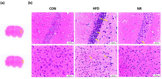 Representative photographs of hematoxylin and eosin (H and E)-stained brain sections. (a) The areas examined in the brain were marked with yellow boxes. (b) H and E-stained brain sections. Original magnification 400×. Yellow arrows indicate karyopyknosis of cells. CON, control; HFD, high-fat diet; NR, nicotinamide riboside.