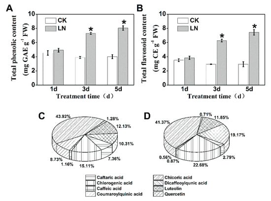 (A) Total phenolic content and (B) flavonoid content in lettuce cultivated under adequate (CK) or low nitrogen solution (LN). The percentage contribution of individual phenolic compounds to the total phenolics in lettuce extracts after 5 days of CK (C) or LN treatment (D). Data represent means ± SD (n = 6). * indicates significant difference at P < 0.05 between LN and CK.