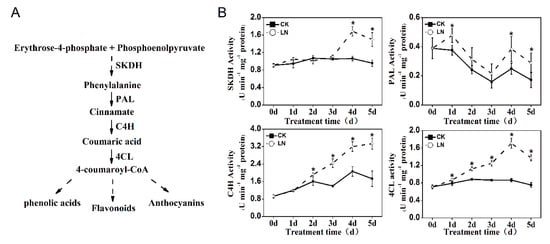 (A) Simplified scheme of the phenolic biosynthesis pathway and (B) the time course data of the activities of enzymes involved in phenolic biosynthesis in lettuce subjected to reduced nitrogen supply. The enzymes investigated are shikimate dehydrogenase (SKDH), phenylalanine ammonia-lyase (PAL), 4-coumarate coenzyme A ligase (4CL), and cinnamate 4-hydroxylase (C4L). Data represent are means ± SD (n = 6). * indicates significant difference at P < 0.05 between LN and CK.