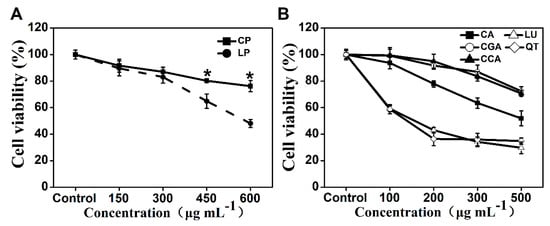 The cell proliferation analysis was performed using the MTT method as reported previously []. The Caco-2 cells were seeded in a 96-well plate at a density of 5 × 103 cells per well and then incubated for 12 h. After pretreatment with CP or LP (150, 300, 450, 600 µg mL−1) or pure phenolic compounds (CA, CGA, CCA, LU, and QT; 100, 200, 300, 500 µg mL−1) for 24 h, MTT at a concentration of 0.5 mg mL−1 was added to each well and incubated for another 4 h. Formazan precipitate was produced and dissolved in 150 µL of DMSO after discarding the supernatant. The absorbance was measured at 570 nm using a SpectraMax i3x microplate reader (Molecular Devices, San Jose, CA, USA).