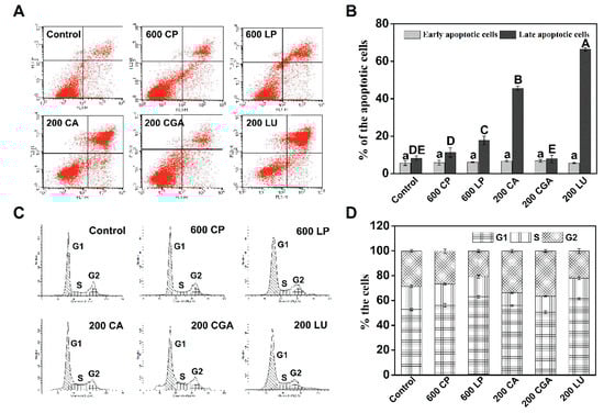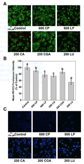 As indicators of cell apoptosis, decreased mitochondrial membrane potential and DNA impairments were determined (Figure 4). Decreased intracellular RH 123 fluorescence intensity results from the efflux of the dye, which is in line with the loss of mitochondrial membrane potential. CP and LP (600 µg mL−1) treatment decreased the fluorescence intensity of RH 123 to 90.32% and 77.65%, respectively. CA, CGA, and LU (200 µg mL−1) treatment also decreased the fluorescence intensity to 75.78%, 86.30%, and 55.46%, respectively. Hoechst 33258 was used to assess nuclear damage (Figure 4C). After treatment with LP, CA, CGA, and LU for 24 h, the number of small bright blue dots representing chromatin condensation and fragmentation were increased compared with the control. Therefore, LP possesses a better biological composition for decreasing mitochondrial membrane potential and increasing DNA damage, compared with CP.