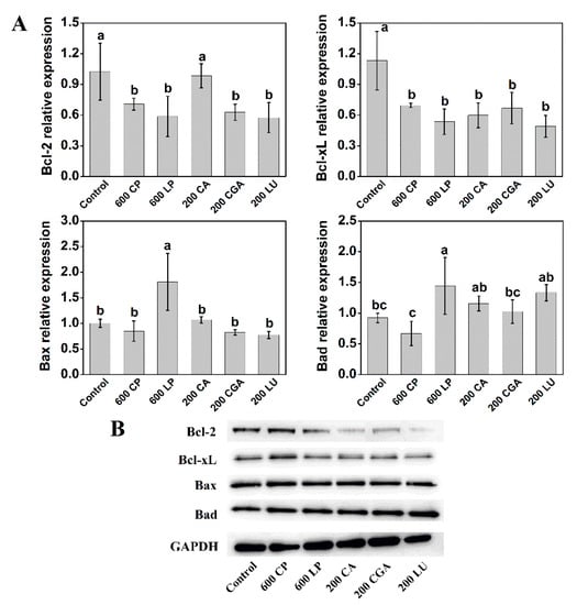 The process of cell apoptosis involves the balanced transcription of anti-apoptotic and pro-apoptotic proteins. To test the mechanisms of cell apoptosis induced by phenolic extracts, the expression of apoptosis-related proteins in Caco-2 cells was further assessed. Treatment with LP (600 µg mL−1) decreased the transcriptional levels of Bcl-2 and Bcl-xL, two anti-apoptotic proteins, by 42.8% and 52.6%, respectively, compared with the control (Figure 6A). However, the CP (600 µg mL−1) treatment only resulted in a decrease in the transcriptional levels of Bcl-2 and Bcl-xL by 31.0% and 38.6%, respectively. On the contrary, Bax and Bad, two pro-apoptotic proteins, were up-regulated upon treatment with phenolic extracts, with higher transcriptional levels observed in LP than CP treatments. The CA, CGA, and LU (200 µg mL−1) treatment also decreased the transcriptional levels of Bcl-2 and Bcl-xL, and increased the transcriptional levels of Bad. The western blot analyses also revealed a similar trend in the protein expression of Bcl-2, Bcl-xL, and Bad, but no significant effects on Bax (Figure 6B).