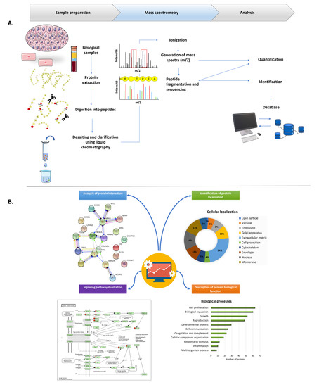Sample preparation and proteomic data analysis at a glance. (A) Standard protocol for proteomic analysis. Proteins extracted from biological samples (tissue, cells, serum, etc.) are first digested by a proteolytic enzyme (generally trypsin). The peptides generated are clarified and separated by liquid chromatography according to their hydrophobicity and/or hydrophilicity. The eluted peptides are then ionized as soon as they enter the analysis unit of the mass spectrometer. This step will further fractionate the peptides and give them mobility that will depend on their charge (z) and molecular weight (m). These two parameters are detected and acquired by mass spectrometry (MS). The peptides are subsequently fragmented and sequenced to obtain information on their amino acid chain. The resulting spectral data allow identification of the starting proteins through use of databases. (B) Proteomic data processing through bioinformatic analysis. Bioinformatic tools available today make it possible to handle hundreds or even thousands of proteins detected by MS. Applications may include determining the localization of identified proteins and characterizing biological processes, signaling pathways in which they are involved and possible interactions that bind the different proteins, as well as streamlining potential new physiological mechanisms. More information on open source bioinformatics tools can be found in [2].