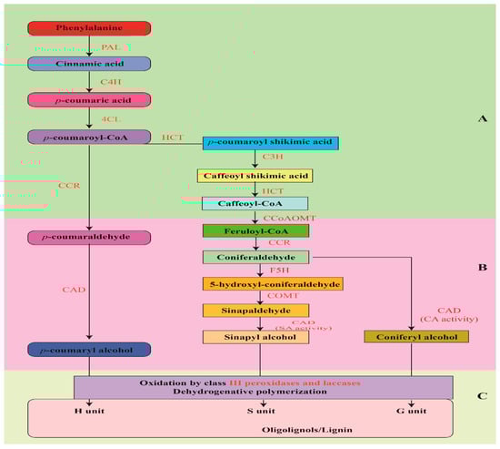 General steps involved in lignin biosynthesis pathway in plants. (A): Phenylpropanoid pathway showing the synthesis process of monolignols from phenylalanine, (B): monolignol-specific pathway, (C): Sub units namely: (guaiacyl), S (syringyl), and H (hydroxyphenyl oxidized from above steps form three-dimensional polymer of lignin.