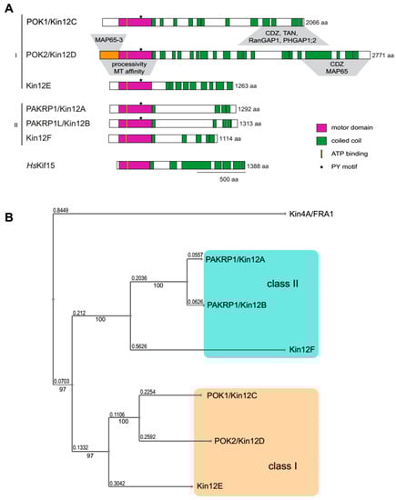 Protein domain architecture and phylogeny of Arabidopsis kinesin-12. (A) Arabidopsis kinesin-12 (Kin12A–F) are categorized in two classes: Class I includes the large PHRAGMOPLAST ORIENTING KINESINS 1 (POK1)/Kin12C and POK2/Kin12D as well as the yet uncharacterized Kin12E; class II consists of PAKRP1/Kin12A, PAKRP1L/Kin12B, and Kin12F. Kinesin-12 members have an N-terminal motor domain indicative of microtubule plus-end directed motility. Unlike the human kinesin-12 HsKif15 and kinesin12F, all other plant kinesin-12 members possess a proline-tyrosine (PY) motif (asterisk), potentially involved in the regulation of motor activity and protein stability. Regions that appear to be important for targeting or interaction with other proteins are depicted above (grey trapezoid). Note the difference in size between the N-terminal region upstream of the motor domain in the plant orthologs and HsKif15. This disordered region is thought to facilitate interactions with other proteins. In the case of POK2/Kin12D, it has been shown that this region (orange bar) serves as a specific binding site to MICROTUBULE-ASSOCIATED PROTEIN 65-3 (MAP65-3) which mediates POK2 recruitment to microtubules. (B) Phylogenetic tree of the Arabidopsis Kinesin-12 family. Kinesin-4/FRA1 was used as an outgroup. Amino acid sequences of full-length proteins were aligned using the multiple sequence alignment program MAFFT and the tree was constructed using the neighbor-joining method and a 1000 bootstrap resampling value, and visualized using Archeopteryx [,]. Bootstrap values and branch lengths are displayed.