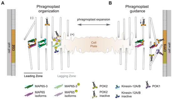 Interestingly, those Arabidopsis kinesin-12 members that localize to the midzone of the phragmoplast also share the microtubule cross-linker MICROTUBULE-ASSOCIATED PROTEIN 65-3 (MAP65-3)/PLEIADE (PLE) as an interaction partner, aiding the maintenance of the bipolar phragmoplast. MAP65 family members play a role in microtubule stabilization (Figure 3) [,]. In particular, MAP65-3 forms cross-bridges between the interdigitating microtubules of the phragmoplast and this cross-linking function is essential for phragmoplast integrity and for cytokinesis [,]. In ple-2 mutants, phragmoplasts display considerably wider midzones, subsequently leading to cytokinesis failure and the formation of incomplete cell walls or stubs and multinucleated cells []. Notably, MAP65-3/PLE emerges at the overlap of the antiparallel microtubules in the anaphase spindle before PAKRP1/Kin12A and PAKRP1L/Kin12B arrive at the phragmoplast midzone []. MAP65-3 seems to be essential for midzone retention of PAKRPs as midzone association of PAKRP1/Kin12A was abolished in dyc283 MAP65-3 mutants []. PAKRP1/Kin12A and PAKRP1L/Kin12B are decorating the interdigitating plus ends of phragmoplast microtubules within the division plane (Figure 3) [,]. The kin12akin12b double mutants fail to organize a functional phragmoplast, as the microtubules between the daughter nuclei do not acquire a bipolar arrangement []. However, this is only observed in dividing microspores whereas somatic cells undergo unperturbed cytokinesis, suggesting functional redundancy in these cells. A recently characterized candidate that might counterbalance the loss of PAKRP1/Kin12A and PAKRP1L/Kin12B function in somatic cells of the respective double mutants is kinesin POK2/Kin12D. It begins to accumulate at the phragmoplast midzone during the transition to cytokinesis and continuously localizes there until the disappearance of the phragmoplast (Figure 2) []. In a motility depended manner, POK2/Kin12D reaches the midzone where it interacts with MAP65-3 and likely some of its isoforms (Figure 3) []. The interaction with MAP65-3 is probably confining POK2/Kin12D at the midzone as it is diminished in ple-2 mutants []. MAP65-3 seems to have a specific affinity for the intrinsically disordered N-terminal region of POK2/Kin12D that directly precedes the motor domain (Figure 1). Moreover, POK2/Kin12D binds to various MAP65 family members including MAP65-3 via its C-terminal domain (Figure 1), which fine-tunes the midzone localization of POK2/Kin12D (Figure 3) []. Most likely, it is this capacity of the POK2/Kin12D C-terminal domain to bind various MAP65 isoforms that retains it at the midzone, even in the absence of MAP65-3/PLE. These various MAP65 isoforms exhibit distinct localization patterns during cytokinesis, decorating the entire phragmoplast or only regions of it. To date experiments investigating the genetic interactions of kinesin-12 with MAP65 members other than MAP65-3 are still needed to untangle functional redundancies. Thus, the topological redundancy of several kinesin-12 members at the midzone might essentially provide functional phragmoplast organization and expansion. Along these lines, it would be interesting to examine whether similar interaction modules exist between kinesin-12 and MAP65 in basal land plants. The kinesin-12 family in Physcomitrella is remarkably expanded, containing sixteen members that belong to class I (related to POKs) and four to class ΙΙ (related to PAKRP1/Kin12A and PAKRP1L/Kin12B), whereas at least three out of the five PpMAP65 members produce severe phenotypes upon simultaneous depletion (Figure 1) [,,].