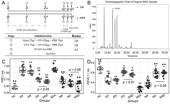 Flowchart and administration of establishing asthmatic phenotypes, including sensitization, challenge, and sacrifice (A). The characteristic chromatographic chart of testing injection samples after 20 consecutive injections (B). The statistics of functional residual capacity (FRC) (C) and forced expiratory volume in 0.1 s (FEV0.1) (D) of mice in all groups. i.p: intraperitoneal; a.i: atomized inhalation. HC: healthy control; EA: eosinophilic asthma murine model; ER: EA treated with RWC; ED: EA treated with DEX; ERD: EA treated with RWC and DEX; NEA: non-eosinophilic asthma murine model; NR: NEA treated with RWC; ND: NEA treated with DEX; NRD: NEA treated with RWC and DEX. * p < 0.05 vs. HC; ** p < 0.01 vs. HC; ## p < 0.01 vs. EA; ▲ p < 0.05 vs. NEA; ▲▲ p < 0.01 vs. NEA. The statistics between ED and ERD and ND and NRD were provided directly in the plot.