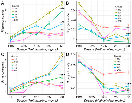 The testing results of airway hyperresponsiveness (AHR) of mice in the groups based on the inflammatory phenotypes. The airway of mice was stimulated with methacholine at different concentration (PBS, 6.25 mg/mL, 12.5 mg/mL, 25 mg/mL, and 50 mg/mL). Airway resistance of inspiration (RI) in EA (A) and NEA (C) and dynamic compliance (Cdyn) in EA (B) and NEA (D) were statistically evaluated based on the data of 50 mg/mL treatment. * p <0.05 vs. HC; ** p <0.01 vs. HC; # p <0.05 vs. EA; ## p <0.05 vs. EA; ▲ p < 0.05 vs. NEA; ▲▲ p < 0.01 vs. NEA.