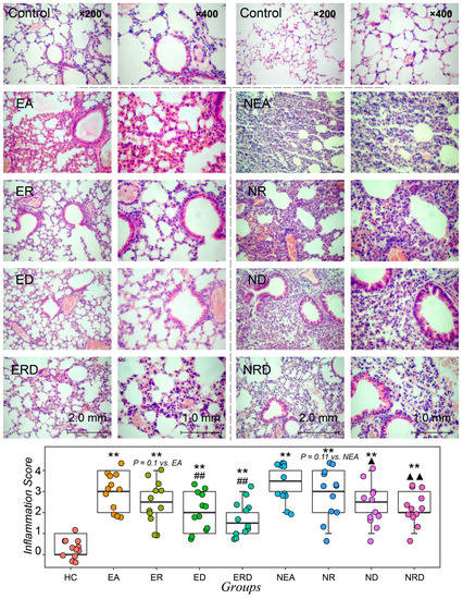 The H&E staining results of the left lung of mice in all groups under different magnifications (200× and 400×). The histopathological assessment score of inflammatory status of all groups was based on the assessment criteria provided in Section 4. ** p < 0.01 vs. HC; ## p < 0.05 vs. EA; ▲ p < 0.05 vs. NEA; ▲▲ p < 0.01 vs. NEA.