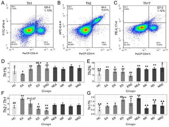 Typical flow cytometry dot plots of helper T cell clusters (including Th1/Th2/Th17, from one of the samples of all groups). (A) Th1 (CD4+–IFN-γ+) in lung tissue; (B) Th2 (CD4+–IL-4+) in lung tissue; (C) Th17 (CD4+–IL-7+) in lung tissue. The statistical data of (D) Th1 cells, (E) Th2 cells, (F) Th2/Th1 ratio and (G) Th17 cells in mice lung tissues with flow cytometry technique. * p < 0.05 vs. HC; ** p < 0.01 vs. HC; ## p < 0.01 vs. EA; # p < 0.05 vs. EA; ▲▲ p < 0.01 vs. NEA.