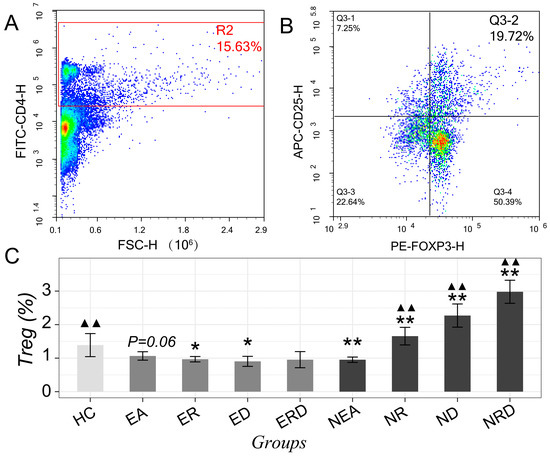Typical flow cytometry dot plots of regulatory T cell clusters. (A) CD4 positive and negative cells in lung tissue; (B) Treg cells (CD4+–CD25+–Foxp3+) in lung tissue. (C) The statistical data of Tregs cells in mice lung tissues with flow cytometry technique. * p < 0.05 vs. HC; ** p < 0.01 vs. HC; ▲▲ p < 0.01 vs. NEA.