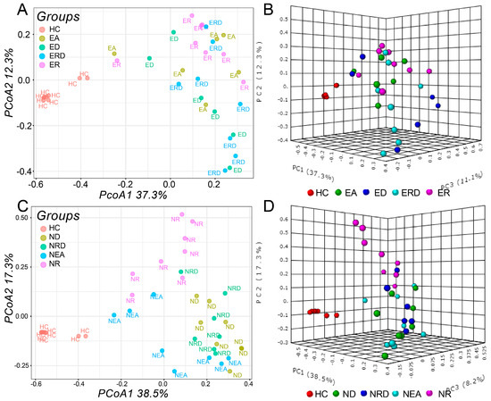 PCoA plots of β-diversity analysis of all groups, which are based on the Bray–Curtis index. PCoA plots (PCoA1 = 37.3%, PCoA2 = 12.3%, PCoA3 = 11.1%) of EA groups in (A) 2D and in (B) 3D. PCoA plots (PCoA1 = 38.5%, PCoA2 = 17.3%, PCoA3 = 8.2%) of NEA groups in (C) 2D and in (D) 3D.
