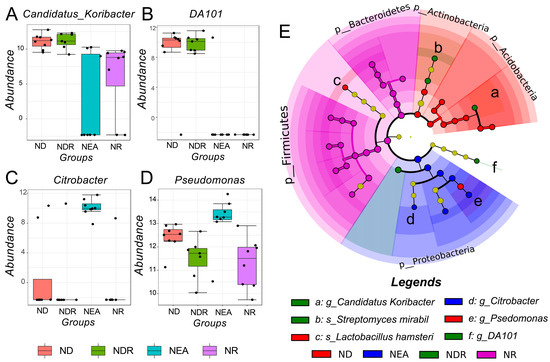 In the model groups, the distinct taxonomies are summarized in Figures S13–S14 and Table S11. In the EA groups, we did not report any significant difference of taxonomies in the levels of phylum, genus, and species. In NEA, no significant differences were observed at the level of phylum (p > 0.05 or LDA < 4). However, a distinction involving 4 genera (Figure 9A–D) and 2 species (Table 1) was observed. The cladogram relationship of the different taxonomies in the NEA group is displayed in Figure 9E.